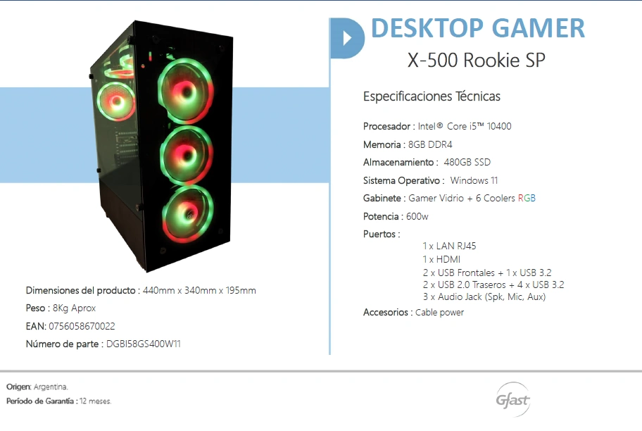 Computadora de Escritorio GFAST Desktop Intel Core i5 480SSD + 8GB Windows 11